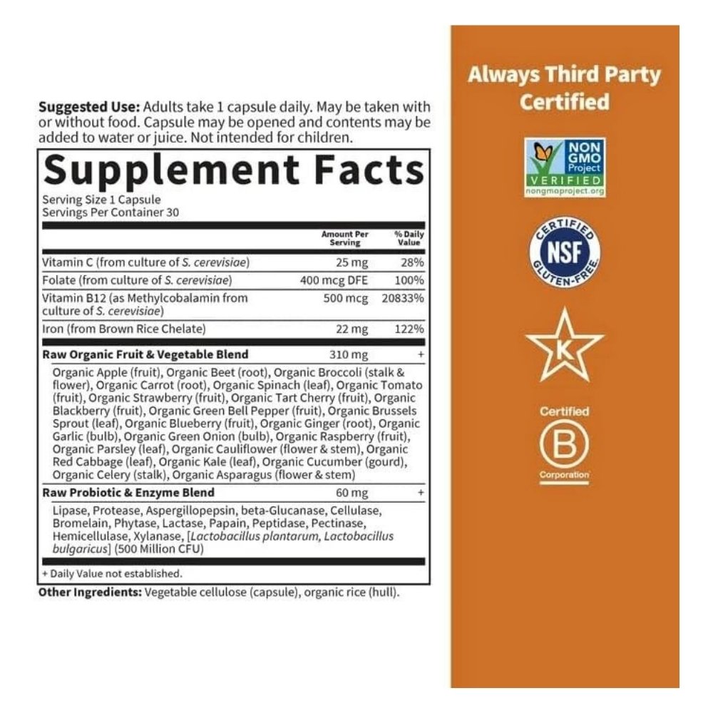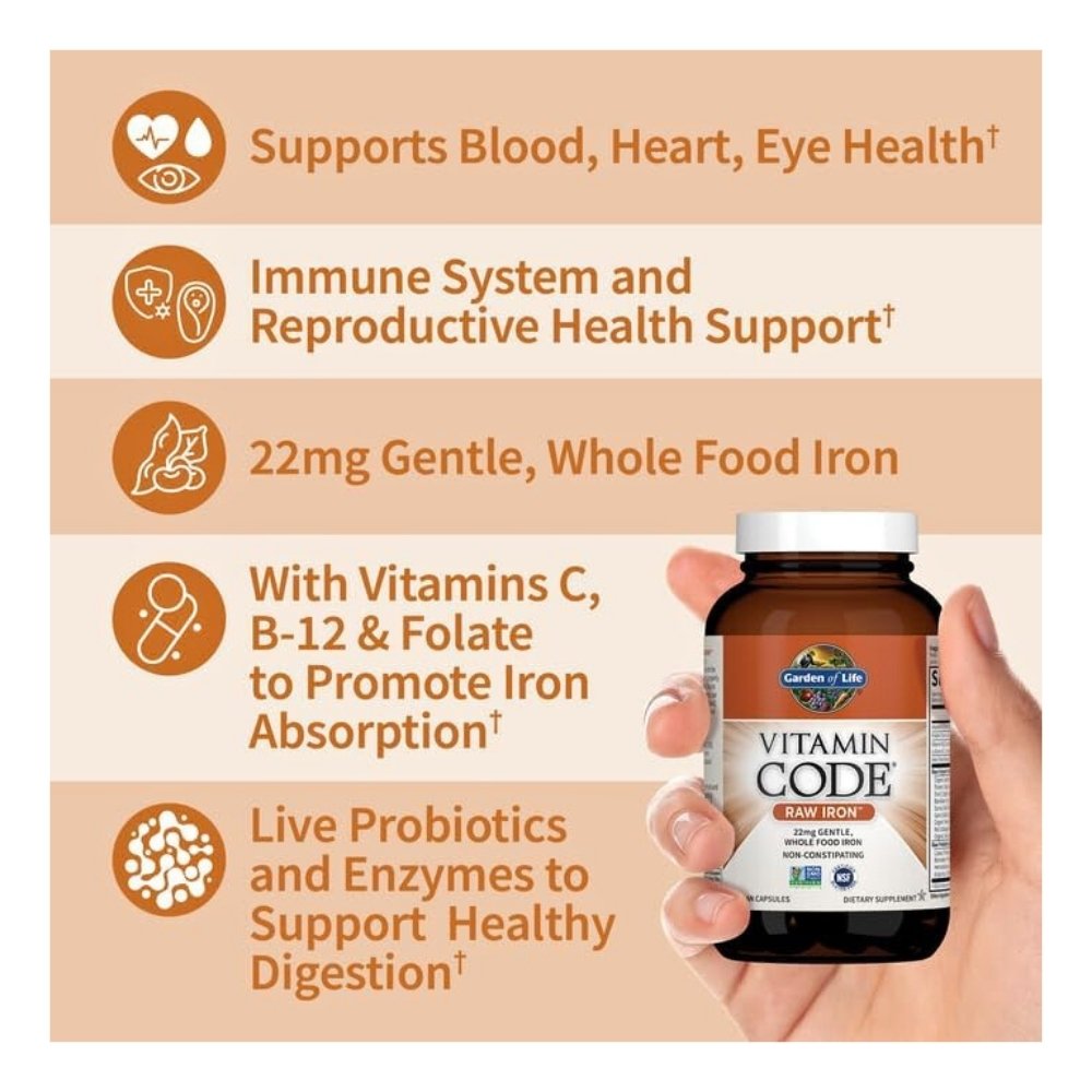 Vitamin Code Raw Iron contains 22mg of gentle whole food iron including whole food vitamins C, B12, Folate to support iron absorption and utilization. The formaula also contains Probiotics and enzymes blend for digestive support. This unique formula supports blood, heart, immune, reproductive, eye and mental health and Physical energy. It is specifically formulated for adults seeking to maintain healthy iron levels while supporting overall wellness.