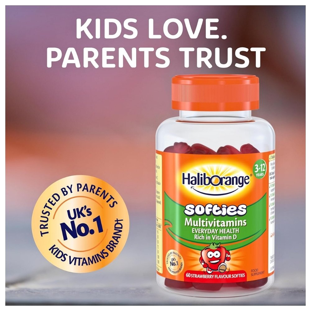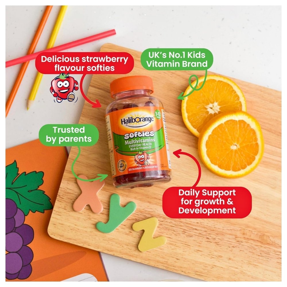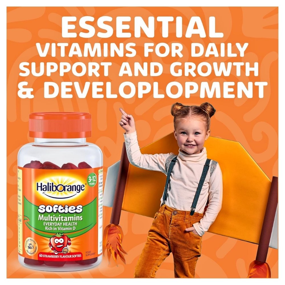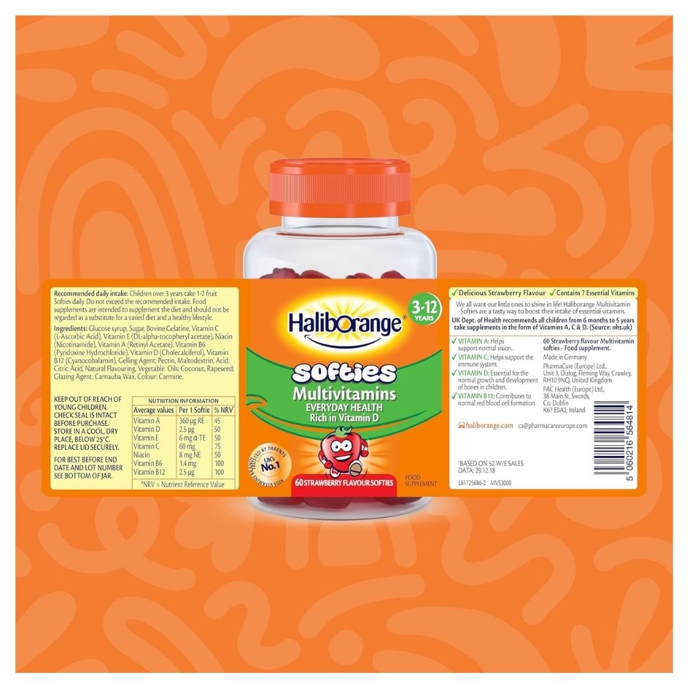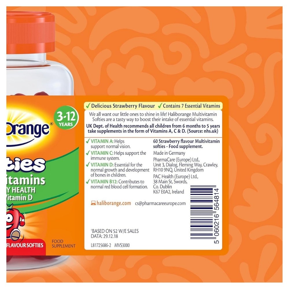 Haliborange Multivitamin Softies are a tasty way for your kids to get the essential nutrients they need everyday. Each yummy strawberry fruit softie contains 8 essential vitamins including Vitamin A, C & D which are recommended by UK Dept. of Health. Vitamin A to help support normal vision, vitamin C to help support the immune system, vitamin D is essential for the normal growth and development of bones in children and vitamin B12 contributes to normal red blood cell formation.