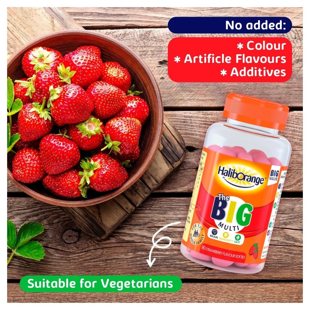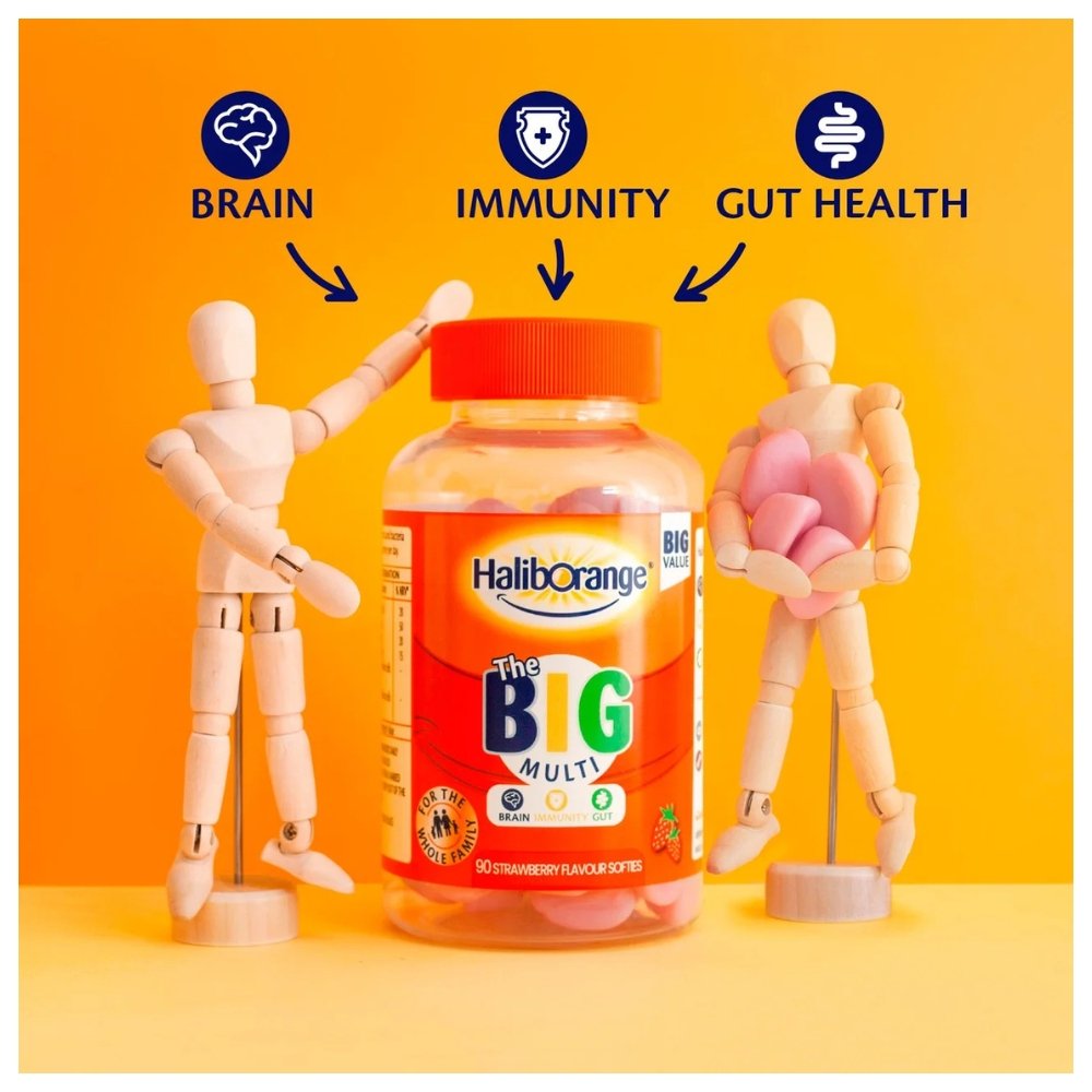 The Big Multi Haliborange provide comprehensive daily support for the whole family from ages 3+, targeting brain performance, immune health, and gut health. These strawberry-flavored gummies combine essential vitamins A, D, B5, and calcium with two types of beneficial bacteria to fill nutritional gaps.