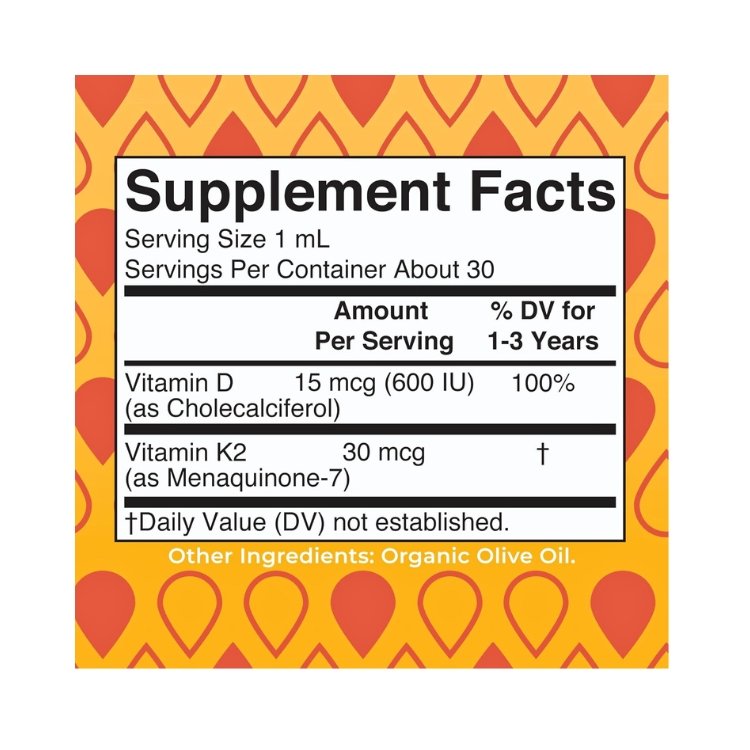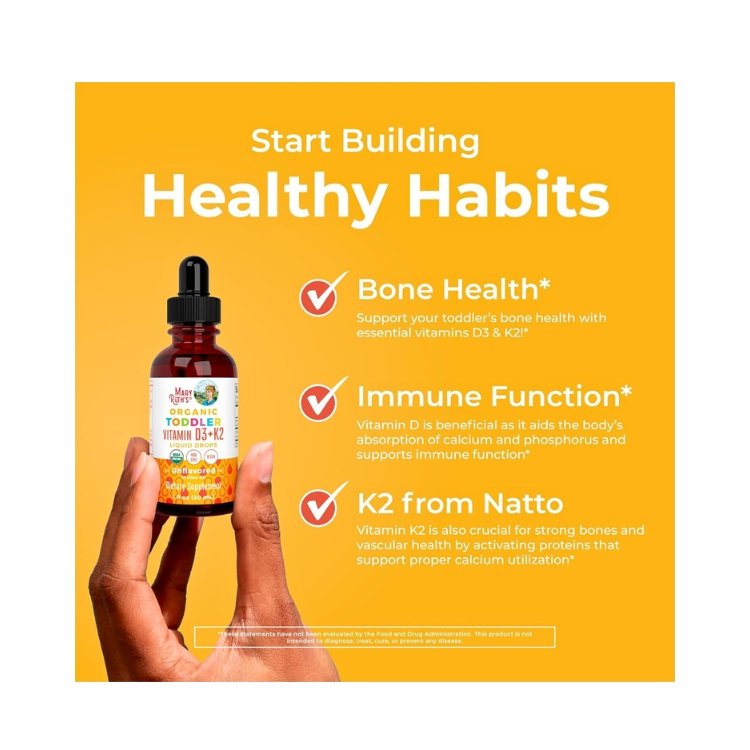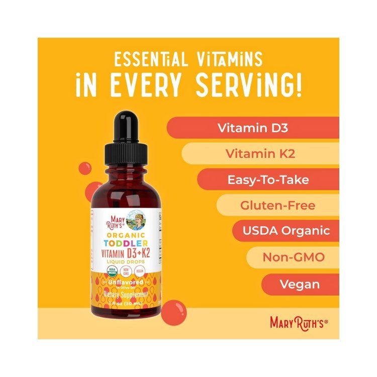 Mary Ruth Organic Toddlers Vitamin D3+K2, helps to support your toddler bone health with these important vitamins. it helps to promote Calcium Absorption and support Vitamins levels with these easy to take unflavoured drops. Vitamins D & K2 are vital for bone Health. Vitamin D aids body absorption of Calcium and phosphorus from the gut, it also support immune function Vitamin K2 is also Crucial for strong bones and arterial health by directing calcium into the bone.