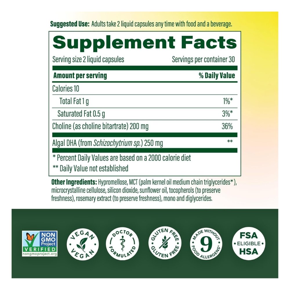 Cognitive & Brain Function: Choline is a precursor to acetylcholine which is crucial for memory and mood, while DHA is a primary structural component of the brain. Together, they improve cognitive function and learning.