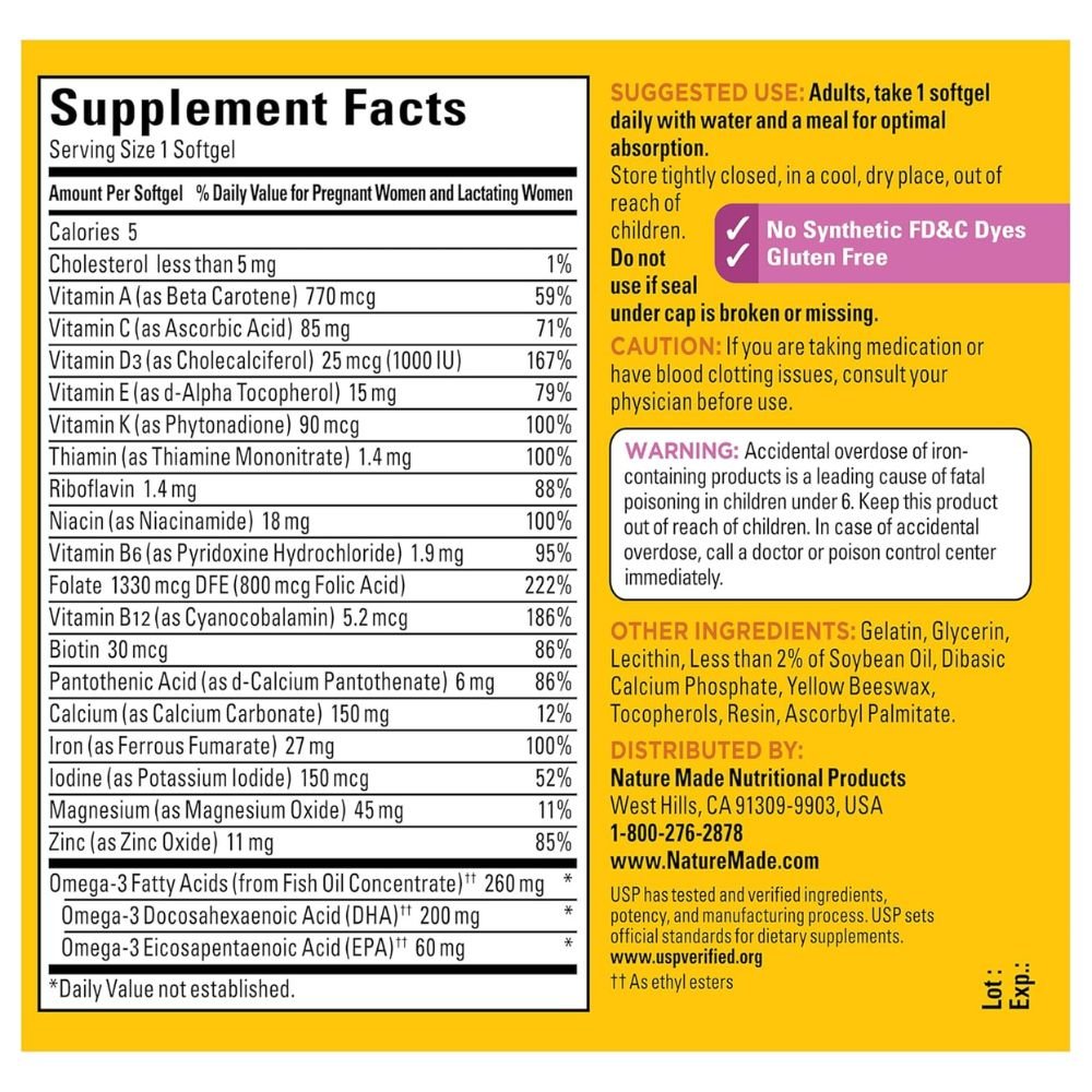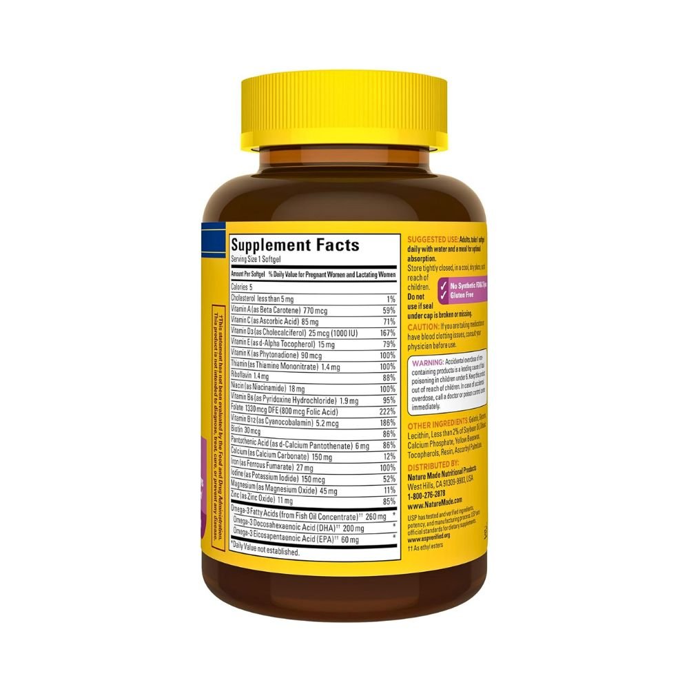 Nature Made Prenatal Vitamins with DHA and prenatal Folic Acid support a baby’s brain health, bone health, eye health, and nervous system development. It also contains nutrients for mom’s health, Magnesium and all eight B Vitamins including Biotin and DHA . It is required by both the Mother and the Growing child. It consists of vital nutrients crucial during pregnancy for fetal brain, nervous system, and retina development. It supports optimal cognitive and visual development in the baby and potentially reduce risks of preterm birth and postpartum depression in the mother.