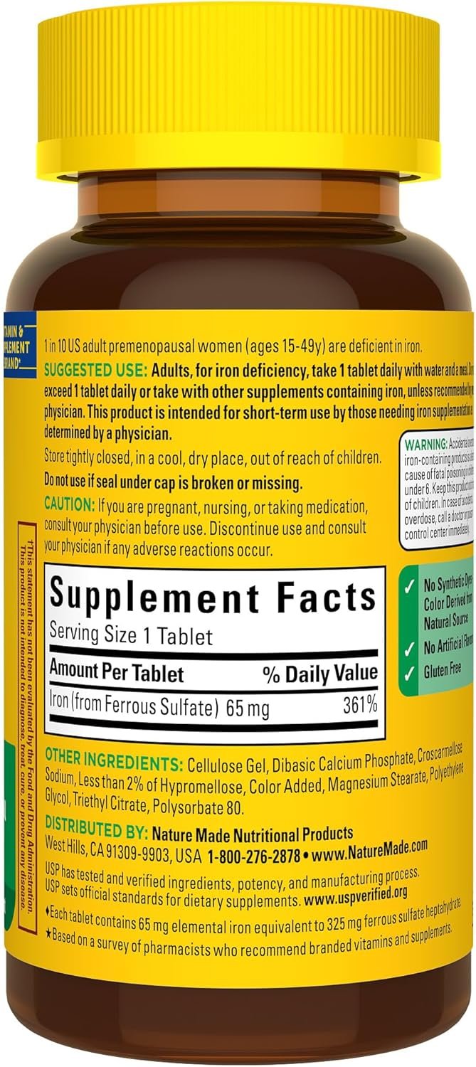 Nature’s Made Iron 65mg Tablet ( 325mg Ferrous Sulfate) Dietary supplement for Red Blood Cell Support, Reduced Fatigue -180 Tablets Exp: