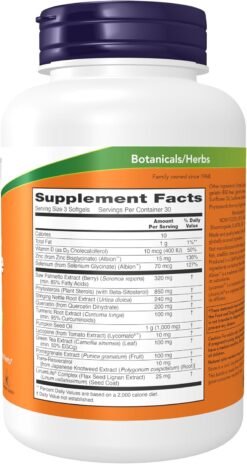 Now Foods Prostate Health is a combination of botanicals and nutrients that support a health prostate gland. It Contain Clinical Beta-Sitosterol & Lycopene at potencies that provide It also provide additional nutritional support with Zinc, selenium, Quercetin and Vitamin D3, all known to play important roles in reducing inflammation and maintaining optimal Prostate function and health.