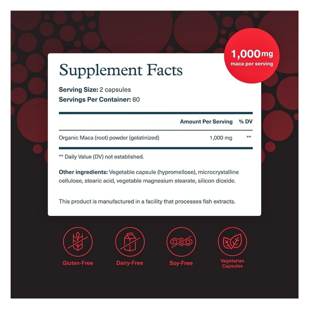 Maca Also known as Peruvian Ginseng is a time tested botanical with health benefits, such as boosting libido, energy, fertility, and improving mood.